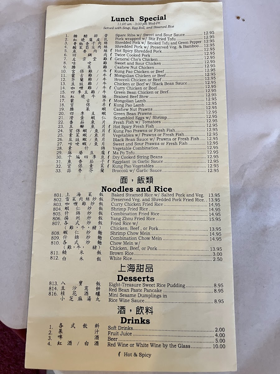 Home-style dishes include options like Spicy Shredded Pork and Cashew Nut Chicken, providing a range of protein and vegetable combinations. Lunch specials offer more affordable choices such as Sweet & Sour Spare Ribs and Pork Wrapped with Stir-Fried Tofu, designed for quick and convenient meals. Specialty items and highlights, including Fried River Shrimp, Clay Pot Rice with Chinese Ham & Bok Choy, and Shanghai Style Ribs, showcase regional flavors and cooking styles.